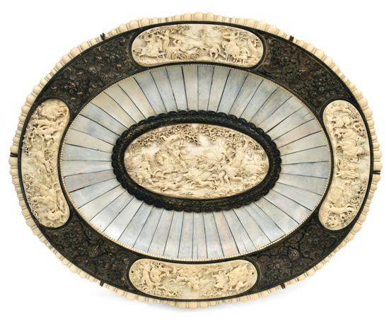 Oval, with a recessed cavetto depicting a finely carved ivory forest scene of men on foot and horseback hunting wild boars framed by a repousse silver band and with radiating strips of ivory extending outwards to the flattened rim mounted with a wide repousse silver band and set with a further four carved hunting scenes depicting deer, rabbits, bears and wolves respectively, 63cm wide ( oval ).