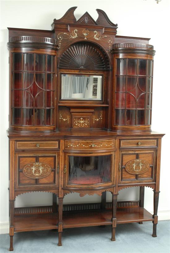 The swan neck pediment above a rectangular back with two astragal glazed panelled cupboards and a central mirror, the bowed lower section with three frieze drawers, above a central glazed cupboard, two panelled doors and an open display shelf, the whole with neo -classical foliate inlay raised on spade feet, 151 x 230 x 47 cm.