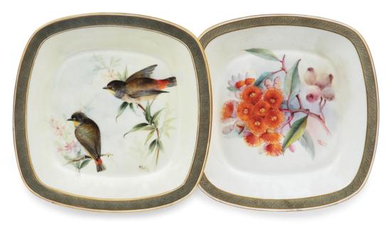 Each of rounded rectangular form, depicting respectively a spray of blossoming Red Gum and two Diamond Spotted birds perched on leafy branches, reserved on a Quaker Grey border with gilt highlights, puce factory marks, hand painted titles, 22 cm wide.