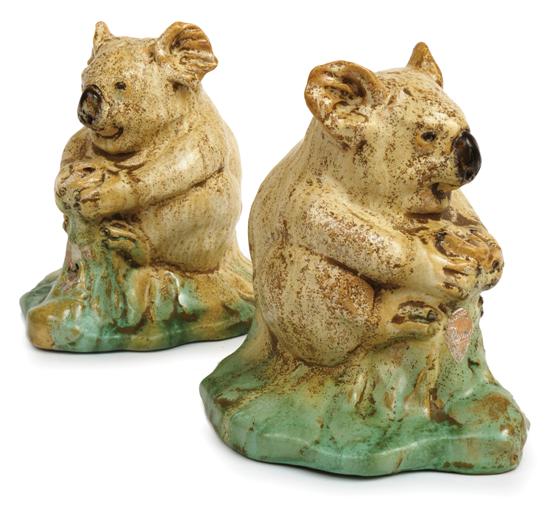 A rare pair of earthenware bookends each naturalistically modelled as a koala nestled on a stump all glazed in beige and green, incised Remued to base and with partial original label to stump, 15cm height.