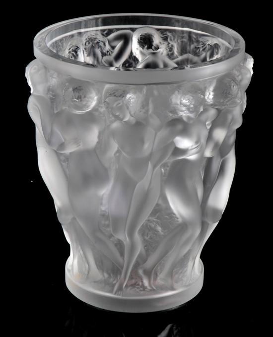 Conical, moulded in frosted glass with repeating design of dancing maidens, incised Lalique France, 25cm high.