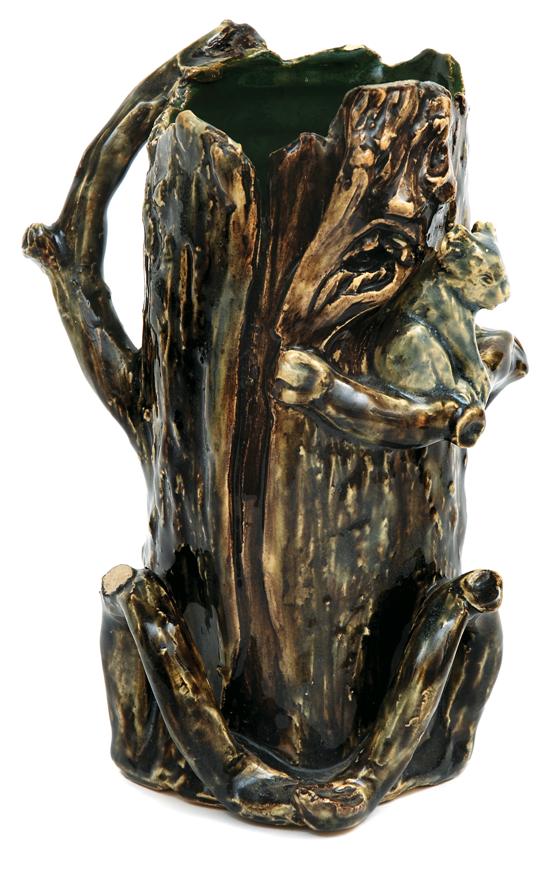 A cylindrical earthenware jug, with a jagged rim fashioned as a tree trunk with a bark like surface and glazed accordingly displays a koala in low relief nestled amongst a series of snarled branches, incised Wm. Ricketts, Potters Sanctuary, Mt. Dandenong, 1936 to base, 19.5cm high.