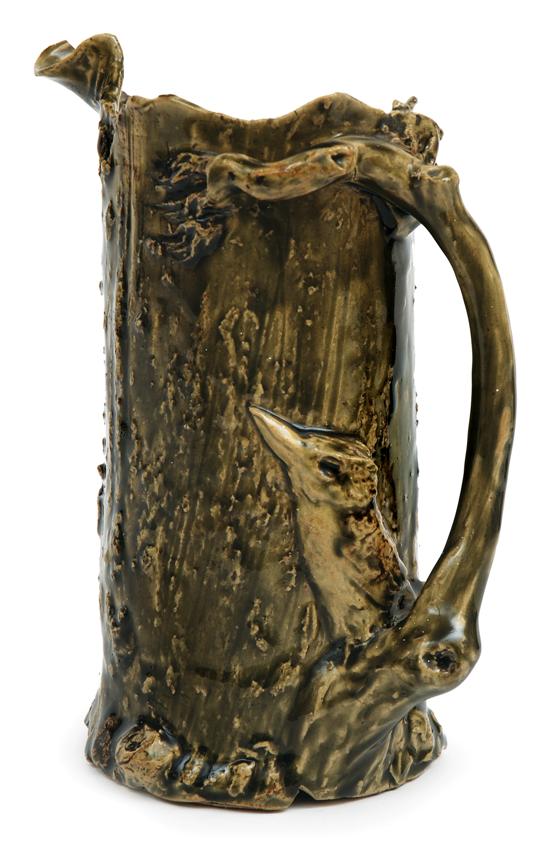 A cylindrical earthenware jug with a bark like surface displays a kookaburra in low relief perched in the bough of the single branched handle all glazed khaki green, (chipped rim with some saved fragments ) incised Potters Sanctuary, Mt.Dandenong, 1937, W.R, to base, 17.5cm high.