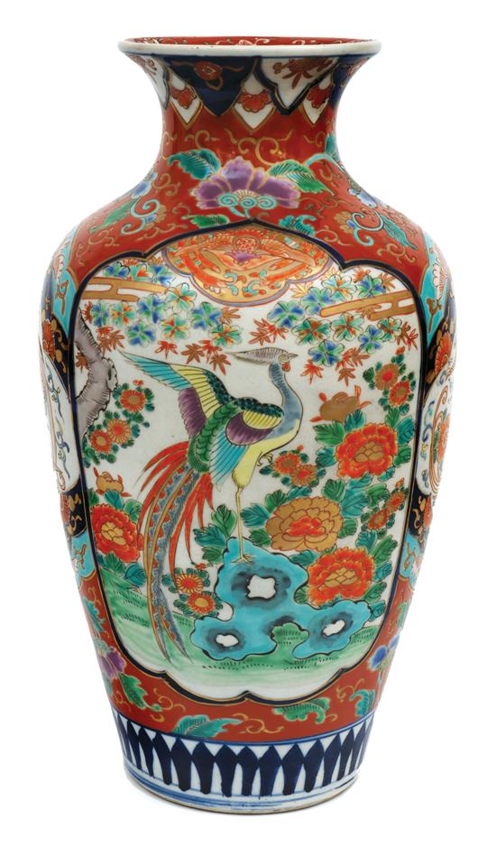 The high shouldered body with a trumpet neck decorated with floral and fenghuang cartouches set within a patterned ground, signed to base and with partial original sticker, 39.5cm high.