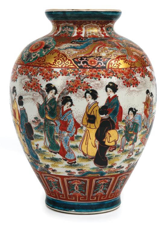 Baluster, depicting a figural scene of a family outing in the round framed by borders of hou-ou and tapestry motifs, hand painted signature cartouche to base, (hairline to shoulder), 24cm high.