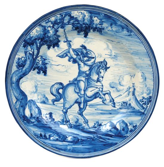 The large scenic platter displays a mounted cavalier riding into battle, blue factory marks to base, 40.5cm diameter.