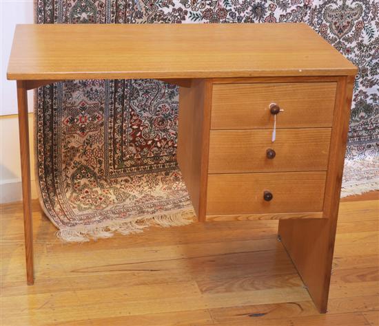 The rectangular top above three drawers each with turned handles, flanked by an angular support, unsigned, 91.5 x 76 x 50 cm.