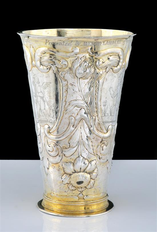 The tall wide mouthed vessel with gilt wash exterior displays a repousse pattern of scrolls and blooms framing a trio of incised cartouches depicting cupid, with a further incised dedication from the 'National Rifle Association, Wimbeldon 1868' to rim, hallmarks to base, 362 grs total weight of silver., 20cm high.