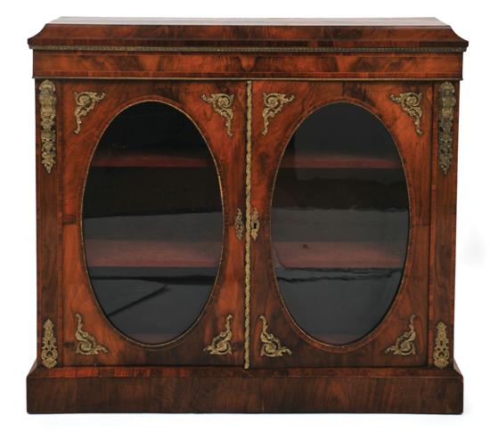 The rectangular ogee moulded top with above two glazed panelled doors, the whole with gilt metal mounts, raised on a plinth base, 119 x 107 x 32 cm.