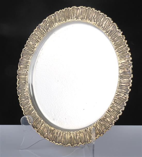 The circular tray recessed and with a hand beaten finish framed by a raised rim and a ribbed gilt wash border with an alternating edge, hallmarked to base, 526 grs. total silver weight, 25.5cm diameter.