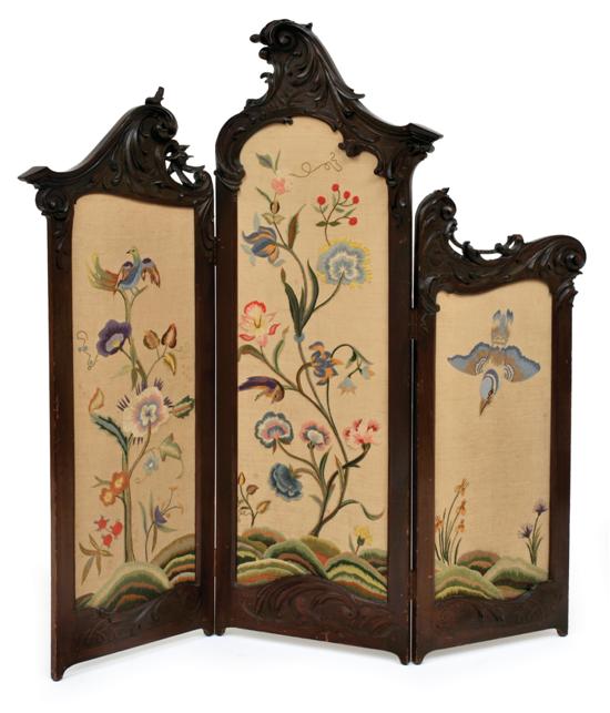 The three fold screen carved as individual panels of alternating heights, each displaying foliate flourishes in high relief to the top and with further flourishes below, each frame containing a hand embroidered in wool on linen panel depicting a floral garden scene with a Kingfisher and other birds,159 x 161.5 cm.