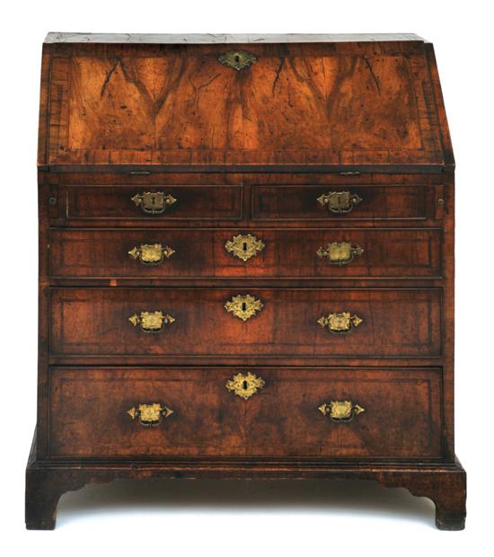 The rectangular top above a drop front writing surface enclosing an interior fitted with drawers, pigeon holes and storage compartments, the lower section with an arrangement of two short and three long cockbeaded drawers with brass drop ring handles, the whole with feather banded inlay, raised on bracket supports, 88 x 100 x 50 cm.