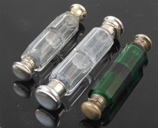 Each of a facetted glass body and to either end a silver plated hinged cap, two of clear glass and the third of green glass, 14cm the longest.