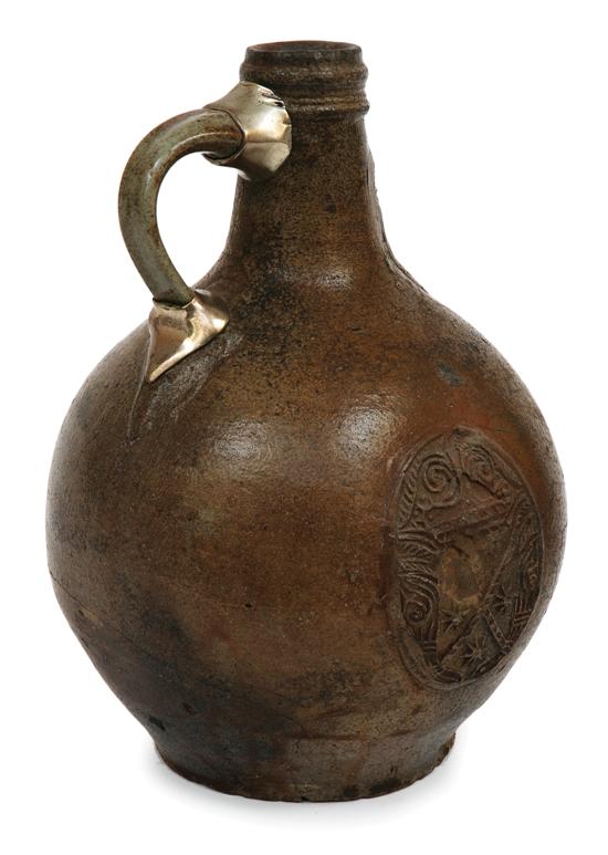The bulbous base rising to a slender neck and with single looped handle fashioned traditionally with a bearded mask to neck and with a further trio of heraldic roundels encircling, wire marks to base, (old repair to the handle), 25cm high.