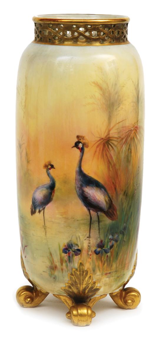 The tall cylindrical vase with a pierced and gilded collar decorated with a continuous scene of exotic water birds all raised on four short scrolled feet, puce factory mark and numbered to base, 22.5cm high.