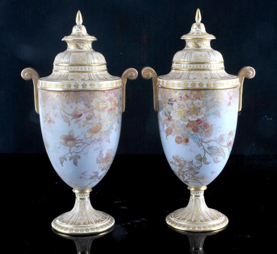 Each of baluster form with a campana neck and flanked by scrolled terminals, the body finely painted with wildflowers and with raised gilt work throughout all raised on a circular foot, printed and impressed factory marks to base, 35cm high.