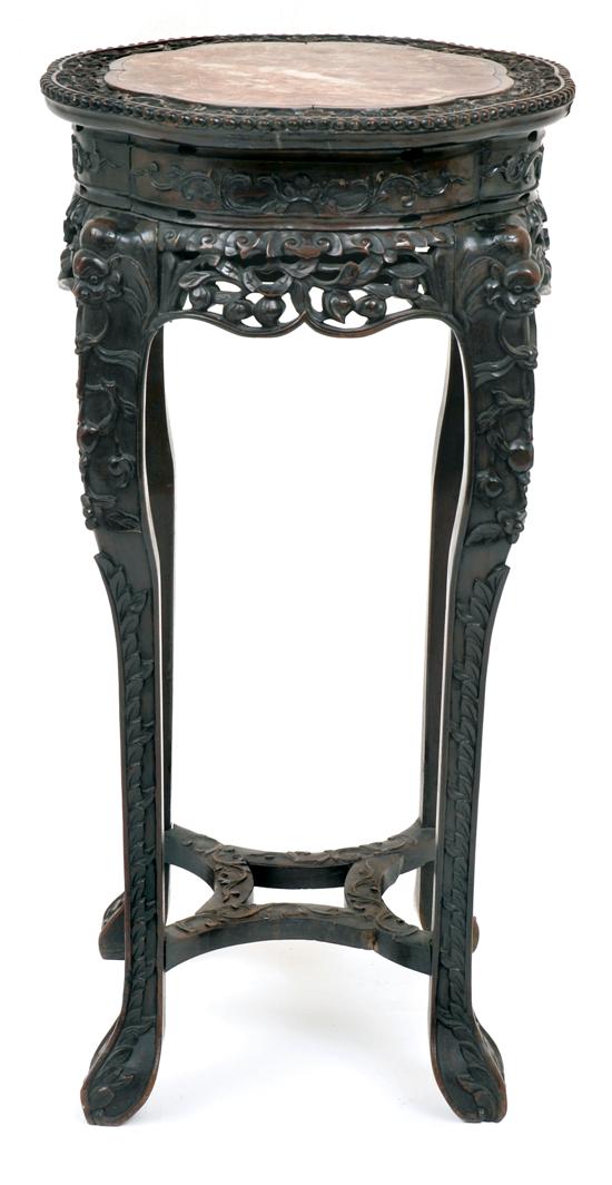 The shaped circular marble inset top above a carved frieze and a pierced apron raised on shaped supports united by cross stretchers, 91cm high.