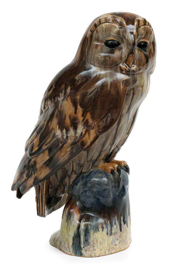 Moulded as a life sized owl perched upon a stepped base drip glazed in browns and blues, painted monogram to base, 36cm high.