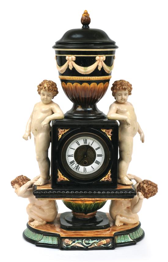 A continental majolica glazed mantel clock