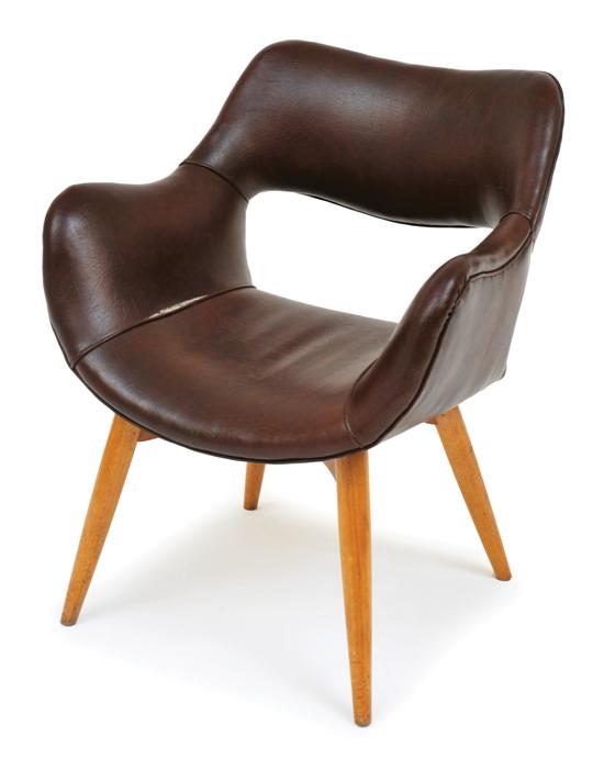 The body of moulded ply with an open back, upholstered in brown vinyl raised on out swept hardwood legs.