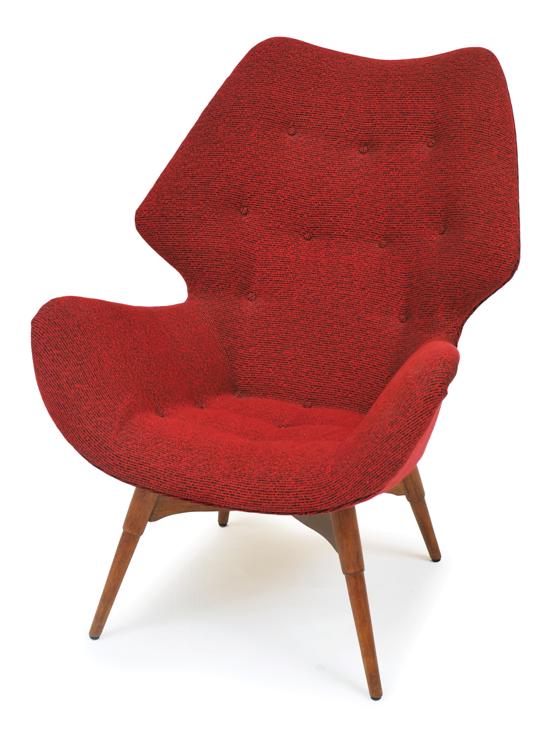The body of moulded ply upholstered in a red and black textured cloth, raised on out swept hardwood legs.