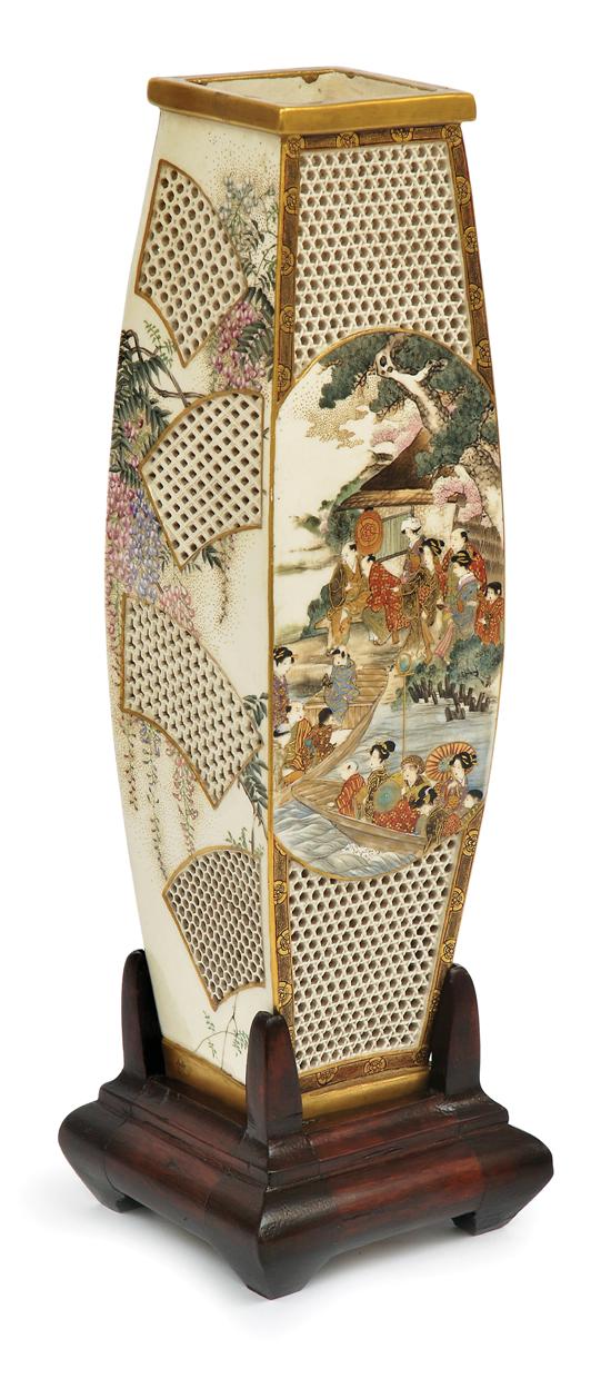 The four sided tubular form ballooning to the mid section displays scenic cartouches to front and verso depicting families at leisure in the countryside framed by honeycomb reticulated panels above and below and with further fan shaped fancy patterned reticulated windows to the alternating sides, complete with four sided framed hardwood stand, signed to base Kyoto, Ryozan above a Shimazu mon, 31cm high (vase).