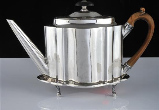 The ovoid tubular form with an undulating exterior and with recessed shoulder rising to a hinged ovoid lid with low set straight spout and single timber mounted handle complete with original ovoid four footed tray, stamped to bases, 556 grs. total weight.