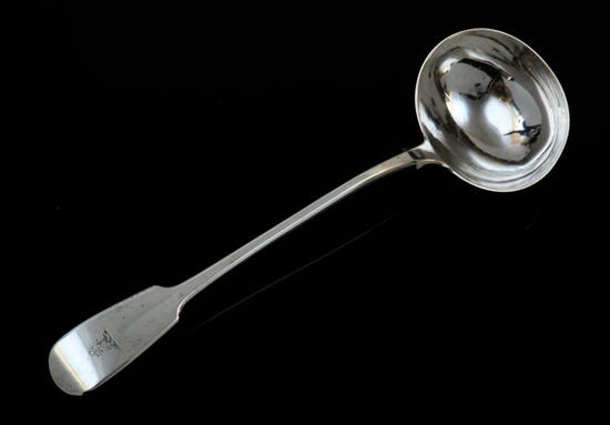 The ovoid ladle , long handled and with splayed end incised to front with a lions head in profile, stamped to verso, 240grs. total weight of silver.