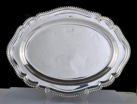 The ovoid platter with recessed flattened rim and reeded rim , incised to reverse Angora, Sheffield reproduction, Silver plated on copper, 49cm long.
