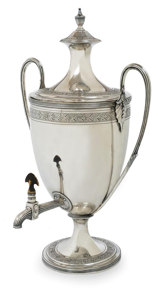 The amphora shaped footed urn flanked by elegant reeded handles surmounted by a fitted cover waisted and with a finial of conforming design, decorated with bright cut foliate bands and incised to verso a dedication 'Rev.Johanni Garrett, Iuventutis mea Cultori et Prasidio, Hic tenuis debetur Honos, Nec tanti abolescet Gratia facti ', 1790, accompanied by a series of hand written translations of inscription, stamped to base,1502grs. total weight of silver.