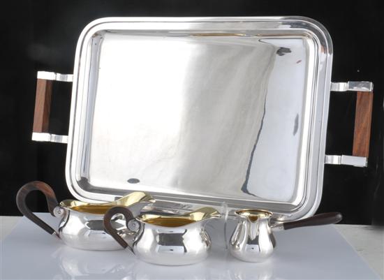 The collection includes a large rectangular tray with twin timber mounted angular handles,a gravy boat of low bombe form with a timber looped handle; a smaller sauce boat of corresponding form and a petite brandy saucepan with single timber handle, each with a gilt wash interior, stamped to base and with retailers mark Karl Friedrich to jugs and saucepan, 1936grs, total weight.