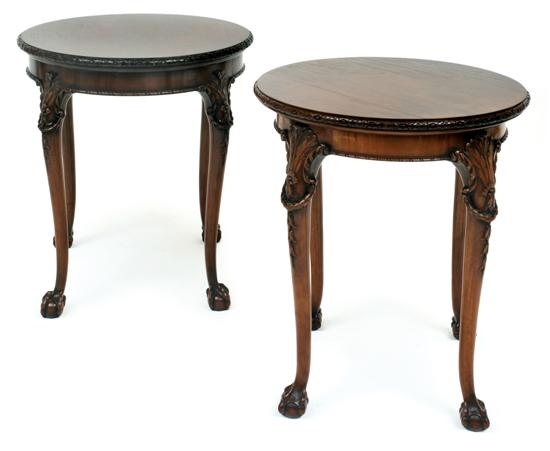 Each of circular top with a carved floral rim set upon a recessed banded skirt punctuated by a series of four carved adornment from which long cabriole legs extend towards ball and claw feet, one table with an applied metal manufacturers label to base, one measuring 75 cm diameter x 66 cm high; the other impressed to underside Waring & Gillow L'Pool measuring 77cm diameter x 69 cm high.