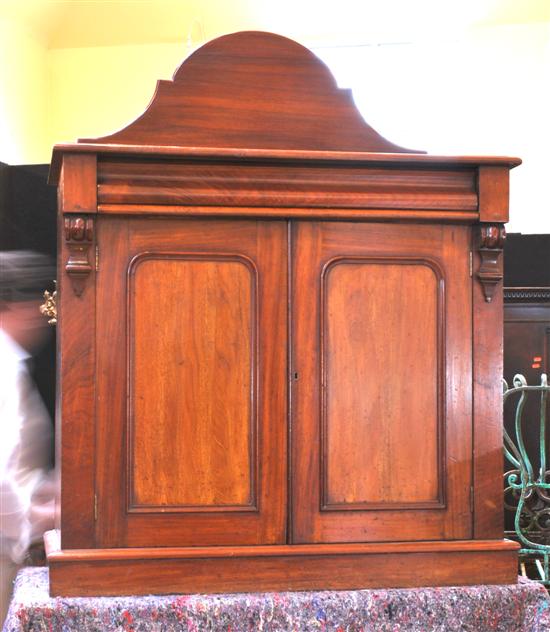 The rectangular carcass with shaped backing board above a single full width drawer with a pair of moulded doors below, each flanked by carved corbels to the side all on a moulded plinth base, 107 x 138 x 51 cm.