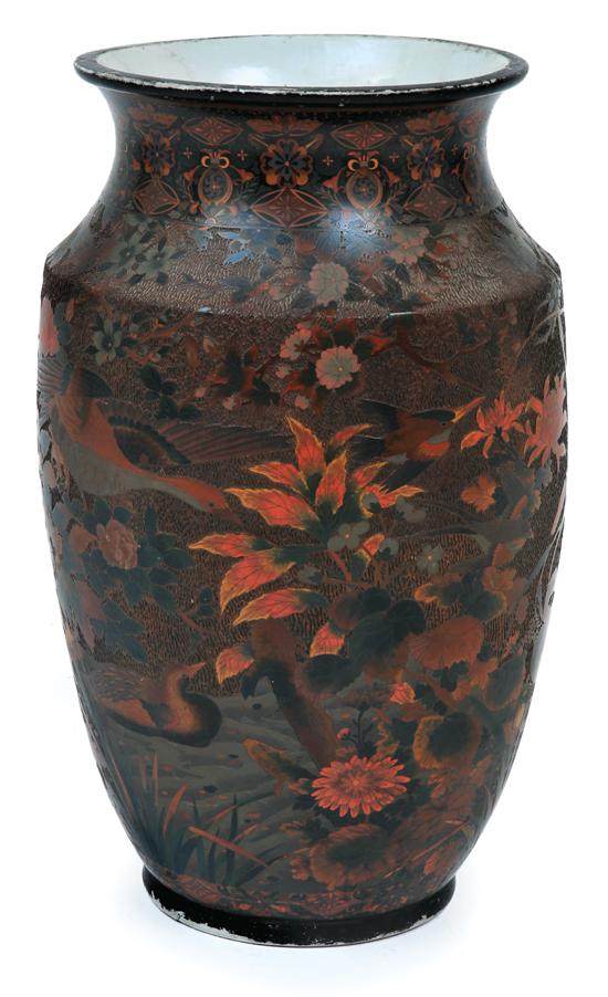 The ovoid vase with receded shoulder and wide rimmed neck formed as a highly detailed wired cloisonne scene depicting a waterside scene of cranes, herons, ducks and other water fowl amongst a background of blossoming foliage all within a textured tree bark reserve on a porcelain ground, surmounted by a wide banded collar displaying repeated stylised geometrical and butterfly motifs, 74cm high.