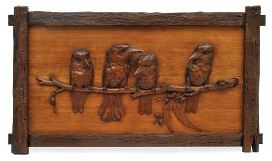 Rectangular, carved in high relief with four Kookaburras perched on a Eucalyptus branch amongst gum leaves and gum nuts, inscribed signature Robert Prenzel / South Yarra / 1926 lower right, within a rough hewn frame, the panel 46 x 92 cm; the frame 62 x 109 cm.