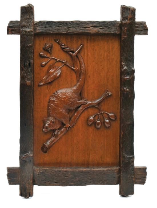 Rectangular, carved in high relief with a possum climbing downwards on a Eucalyptus branch amongst gum leaves and gum nuts, within a rough hewn frame, 53.5 x 35.5; the frame 77 x 58 cm.