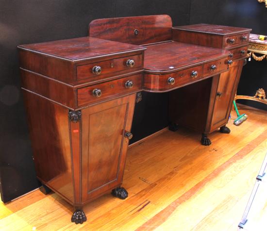 The rectangular top with a bowed central section and a frieze drawer, flanked by drawers to either side, each sarcophagus form pedestal with a panelled door, raised on lion's paw feet, 203.5 x 114.5 x 52.5 cm.