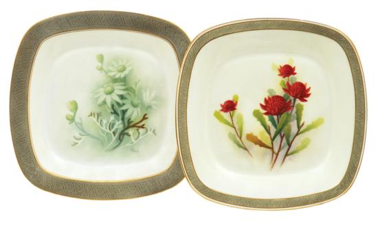 Each of rounded rectangular form, depicting respectively sprays of Australian native flora, reserved on a Quaker Grey border with gilt highlights, puce factory marks, hand painted title to one, 22 cm wide.