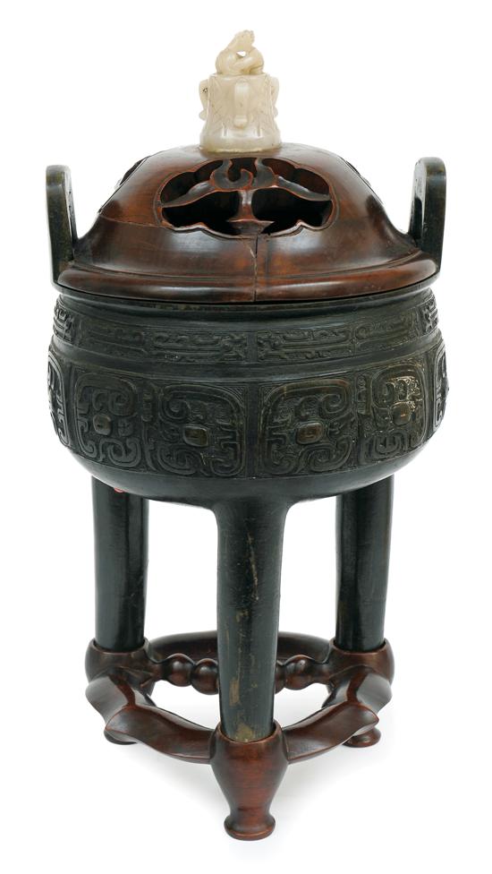 The tripod low sided circular vessel with twin raised handles to each side displays a repeated series of taotie motifs in low relief to the exterior, together with a later rosewood pierced cover with carved hardstone finial and a tripod base with stretcher support, 23 (diameter) x 42.5 cm total height.