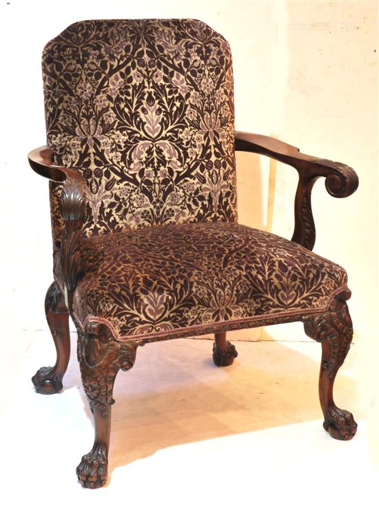The floral upholstered back above leaf capped out swept arms and a fitted seat, raised on boldly carved cabriole legs with lion's paw feet.