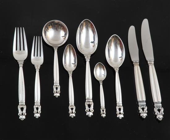 A part setting for six comprising fifty two pieces in total including six main and entree; knives and forks, six dessert and soup spoons, eight fruit spoons, six teaspoons and two serving spoons, 2530 grs. total weight.