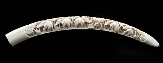 The narrow tusk depicting a repeated scene of elephants within a forest, carved and pierced in high relief along the arch, incised signature to verso and with impressed registration number 7W837131-1, 61cm length.