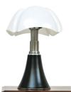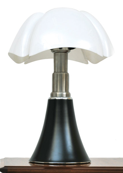 The lamp of a tapering conical base rising to a telescopic brushed steel stem, beneath an opaque white acrylic lobed shade, rubber plaque to base Pipistrello, Martinelli Luce, Design Gae Aulenti, Made in Italy, 73cm high.