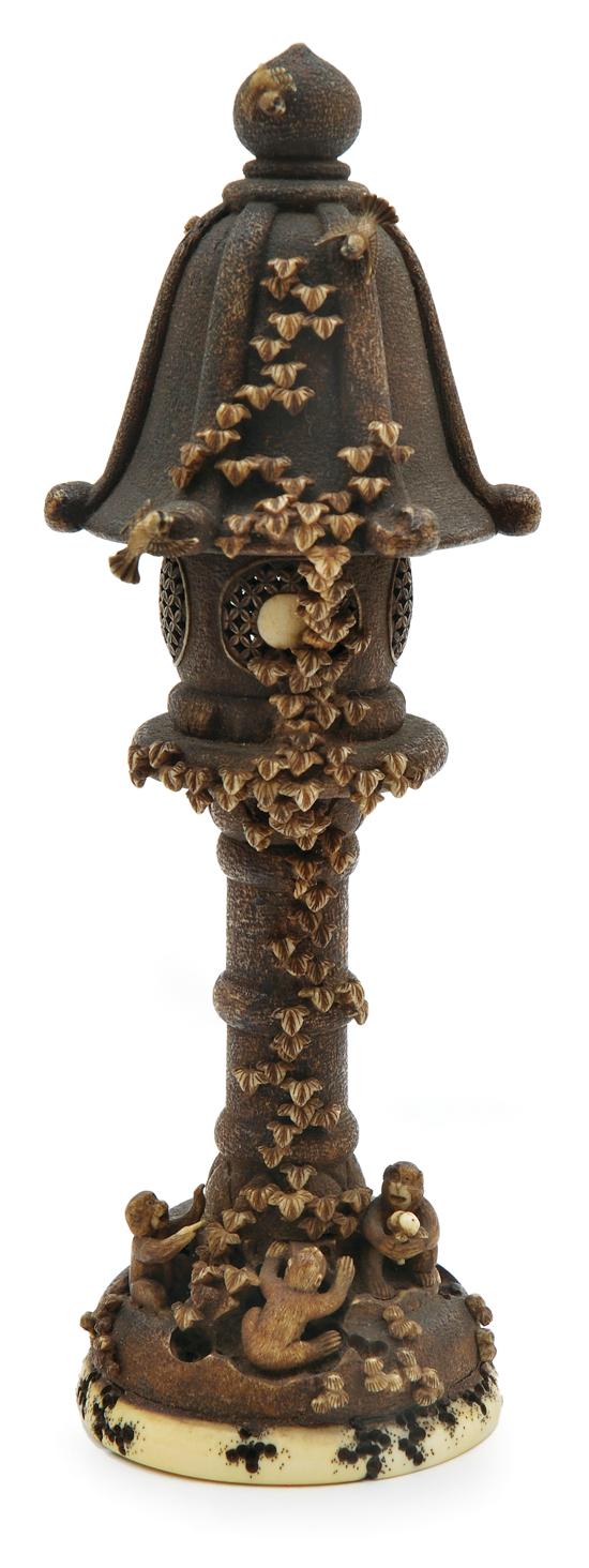 Carved as a miniature pedestal lantern with a reticulated segment centrally, the whole with a stippled and stained surface and overlaid with creeping ivy leaves and fungi sprouts, to the base three monkeys are at play while tiny birds flutter above, contrasted against an unstained base carved with termite holes, incised signature to base, (some minor losses and restoration) 17.5cm high.