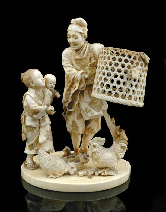 The carved and stained ivory figure group depicting a scene of daily life, with a father grasping a basket cover alongside his daughter who holds a small infant in her arms, whilst at their feet chickens scratch for food, all mounted on a single disc of ivory and included with a later circular carved timber stand, (some losses, cracks and restoration) signed plaque to base, 19.5 cm high (okimono).