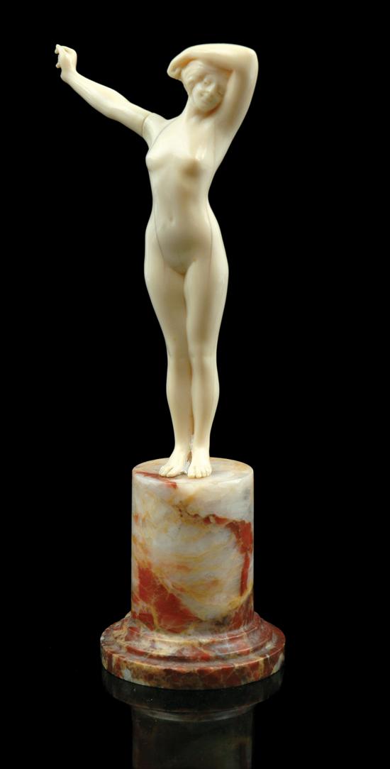 Carved as a standing nude female with one arm out stretched, the other curled over her head, mounted upon a breche columnar plinth (out stretched arm loose), 19cm total height.