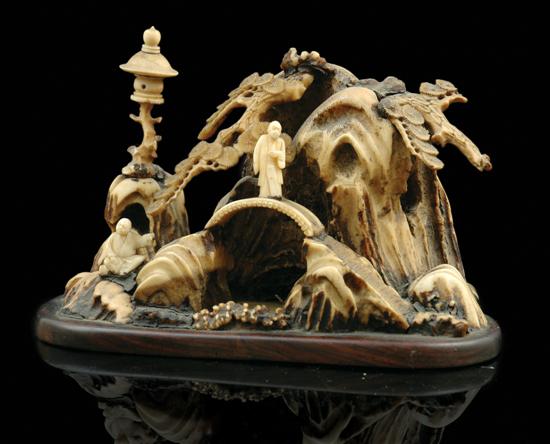 The carved scene displays a rocky cavern with weeping pine trees and a lantern in the distance, to the foreground a small bridge upon which two men are situated on at alternate intervals, all mounted upon an oval rosewood base, paper label to base, (some restoration and looseness to extremities), 11cm high.