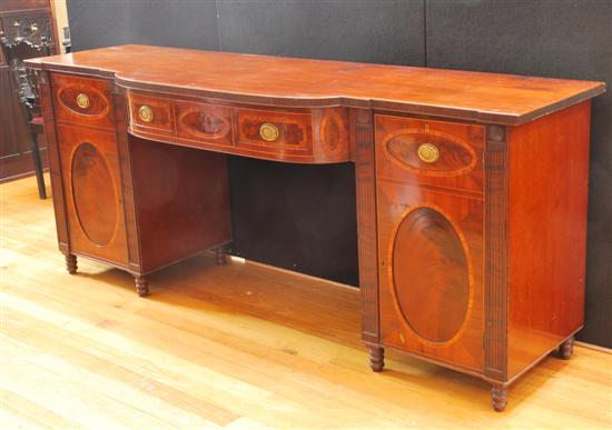 The breakfront rectangular top above a frieze drawer and two panelled cupboard doors, the body inset with recessed oval cartouches with crossbanded borders, raised on turned supports, 222.5 x 92 x 67 cm.