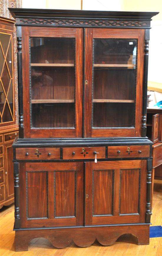 The top with a moulded pediment and cutwork frieze above twin glazed doors with beaded edges and flanked by ebonised corbels, below three shelf drawers with further twin doors also flanked by further ebonised corbels all terminating in a shaped skirt and block feet base, 117 x 197 x 41cm.