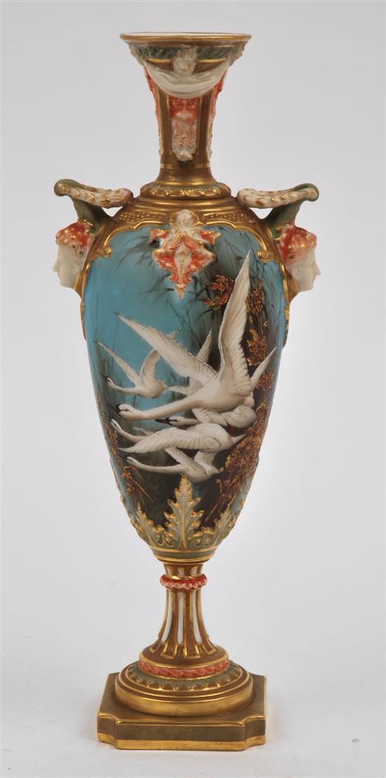 Ovoid, raised on a stepped square foot and to each shoulder a mask head lug all rising to a slender neck with flared rim, the body painted with a scene depicting a flock of white swans in flight on a pale blue ground and with further coloured accents and gilt throughout, signed to front lower right, brown factory mark, Rd.No.141375, pattern number 1410 and further impressed marks to base, (restoration to rim), 28cm high.